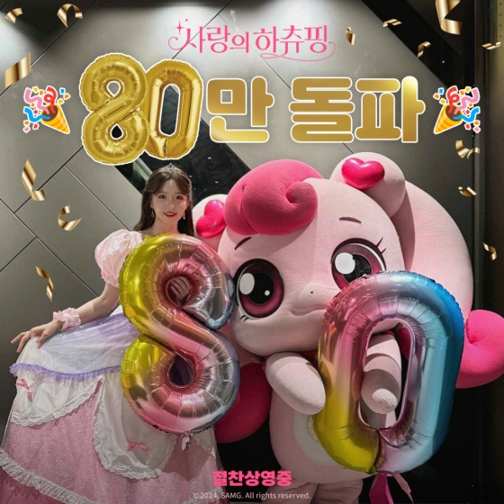 한편 '사랑의 하츄핑'의 주인공 하츄핑과 오리지널 로미 역의 가창 연기를 맡은 팝페라 가수이자 뮤지컬 '오페라의 유령'의 배우 송은혜가 80만 관객 돌파 인증샷을 공개했다. 이 둘은 80만을 뜻하는 숫자 풍선을 든 채 영화에 대해 아낌없는 사랑과 호응을 보내준 관객들에게 감사 인사를 전해 이목을 집중시킨다.