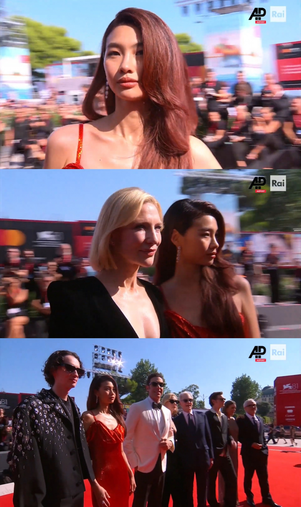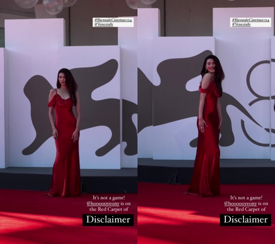정호연은 29일(현지 시간) Apple TV+ '누군가는 알고 있다 -- Disclaimer'의 감독 알폰소 쿠아론, 배우 케이트 블란쳇, 케빈 클라인, 사샤 바론 코헨, 코디 스밋 맥피, 루이스 패트리지, 레일라 조지와 함께 '제81회 베니스국제영화제' 레드카펫을 밟았다. 강렬하고 화려하게 빛나는 레드 드레스를 완벽하게 소화한 그는 쏟아지는 스포트라이트에 환한 미소로 응답해 시선을 집중시켰다. 특히 케이트 블란쳇과 화기애애한 투 샷은 극 중 두 사람의 호흡에 대한 기대감을 끌어올렸다.