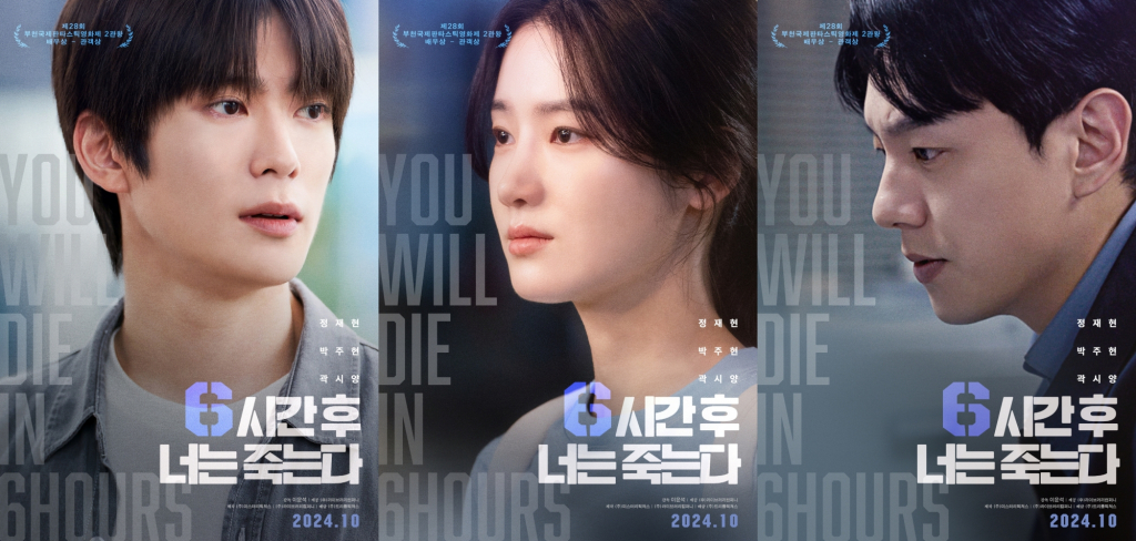 2024년 제28회 부천국제판타스틱영화제 배우상(박주현), 관객상을 수상한 타임리미트 감성 미스터리 추리극 '6시간 후 너는 죽는다'가 10월 개봉을 알리며 죽음 예언자 '준우' 역의 정재현, 죽음 예언의 주인공 '정윤' 역의 박주현, 연쇄 살인범을 쫓는 강력계 형사 '기훈' 역의 곽시양까지 3인 3색 런칭 포스터와 런칭 영상 3종을 공개했다.