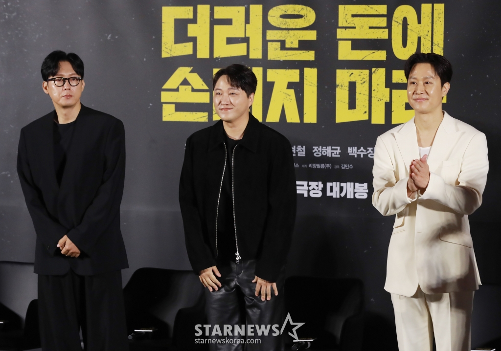 26일 오전 서울 용산구 CGV용산아이파크몰에서 영화 '더러운 돈에 손대지 마라'(감독 김민수) 제작보고회가 열렸다. 이날 행사에는 배우 정우, 김대명, 박병은 배우, 김민수 감독이 참석했다.