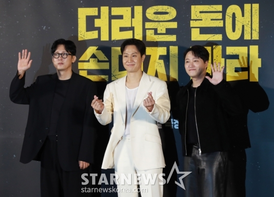 배우 박병운, 정우, 김대명이 26일 오전 서울 CGV용산아이파크몰에서 진행된 영화 '더러운 돈에 손대지 마라'(감독 김민수) 제작발표회에 참석해 포즈를 취하고 있다.