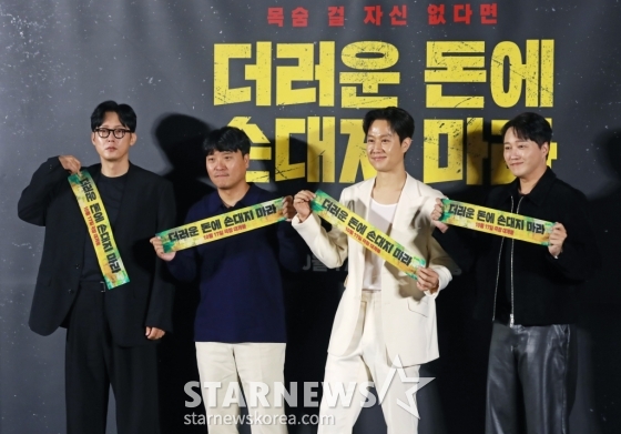 배우 박병운, 김민수 감독, 배우 정우, 김대명이 26일 오전 서울 CGV용산아이파크몰에서 진행된 영화 '더러운 돈에 손대지 마라'(감독 김민수) 제작발표회에 참석해 포즈를 취하고 있다.
