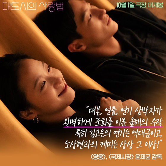 뿐만 아니라 "유쾌하고 행복한 기분이 팡팡 터졌다. 그리고 가벼워서 새롭다. 정말 기다렸다, 이런 영화"('비밀은 없다' '미쓰 홍당무' 이경미 감독), "대본, 연출, 연기 삼박자가 완벽하게 조화를 이룬 올해의 수작. 특히 김고은의 연기는 역대급이고, 노상현과의 케미는 상상 그 이상"('영웅' '국제시장' 윤제균 감독), "경쾌하면서도 날카로운 작품"('야당' '특수본' 황병국 감독), "웃음과 깊이, 새로움, 그리고 배우들의 신들린 연기까지, 개인적으로 꼽는 올해 최고의 영화"('사냥의 시간' '파수꾼' 윤성현 감독), "모든 장면이 예상을 벗어남과 동시에 공감이 간다. 가을에 극장에 가야 할 이유"('스윙키즈' '써니' 강형철 감독) 등 감독들의 다채로운 극찬이 전해져 '대도시의 사랑법'에 대한 궁금증을 배가시킨다.
