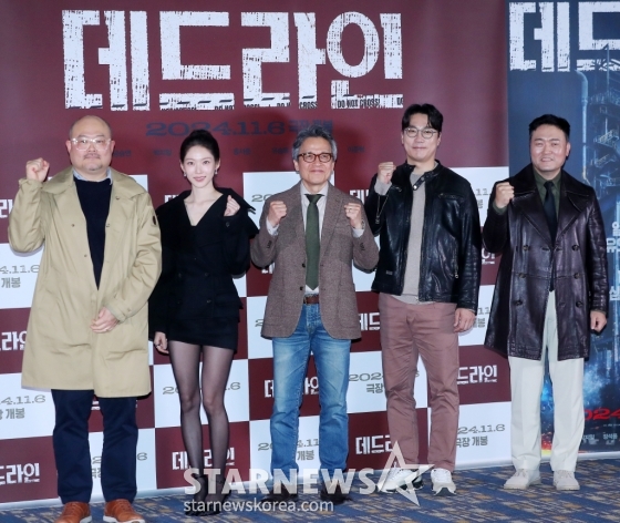 권봉근 감독, 배우 박지일, 공승연, 홍서준, 이준혁이 25일 오후 서울 송파구 롯데월드타워 롯데시네마에서 진행된 영화 '데드라인' 언론시사회 및 기자간담회에 참석해 포즈를 취하고 있다.