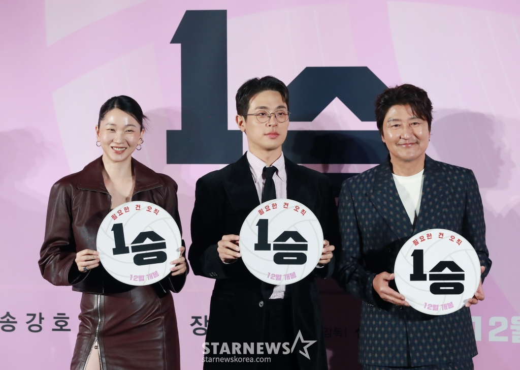 송강호는 '1승' 출연 이유에 대해 "'기생충'(2019) 이후 그동안 해온 작품과는 좀 다른 성향의 작품을 해보고 싶었다. 소박하고 작을 수 있는 이야기, 단순할 수 있더라도 그 속에서 관객분들에게 어떤 용기나 즐거움, 행복을 드릴 수 있는 작품이라면 얼마나 좋을까 하던 찰나에 '1승' 시나리오를 접한 거다. 이렇게 밝은 영화를 해보고 싶어서, 솔깃했다"라고 밝혔다.