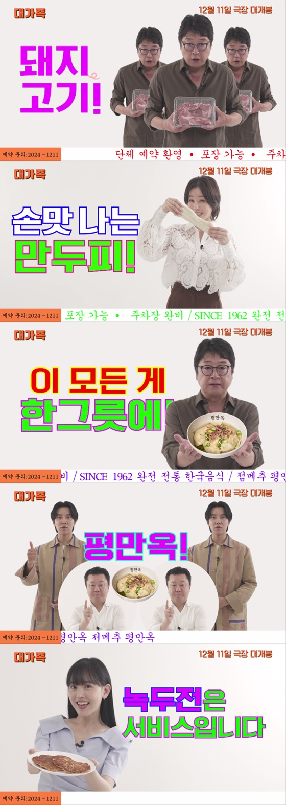케이블TV 지역방송 광고 시간에 등장할 법한 콘셉트의 영상엔 김윤석, 이승기, 김성령, 강한나, 박수영까지 '대가족'의 와글와글한 케미스트리를 담당한 배우들이 총출동해 눈길을 모은다. "유기농 대파, 국내산 돼지고기, 손맛 나는 만두피, 이 모든 것을 한 그릇에! 평만옥! 녹두전은 서비스입니다"라는 대사를 전 배우가 진지하게 소화해 궁금증을 자아낸다.