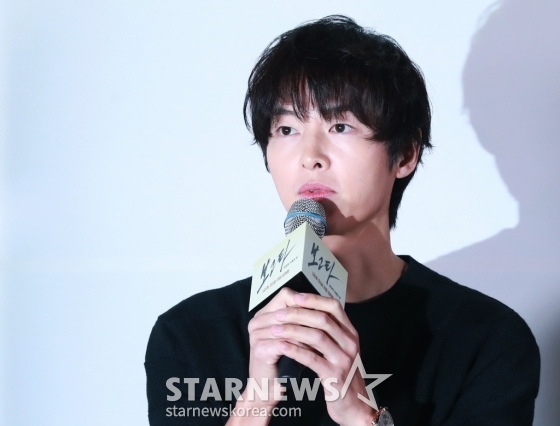 배우 송중기가 19일 오후 서울 메가박스 코엑스에서 진행된 영화 '보고타 : 마지막 기회의 땅'(감독 김성제) 언론배급시사회 및 기자간담회에 참석해 질문에 답하고 있다. /2024.12.19