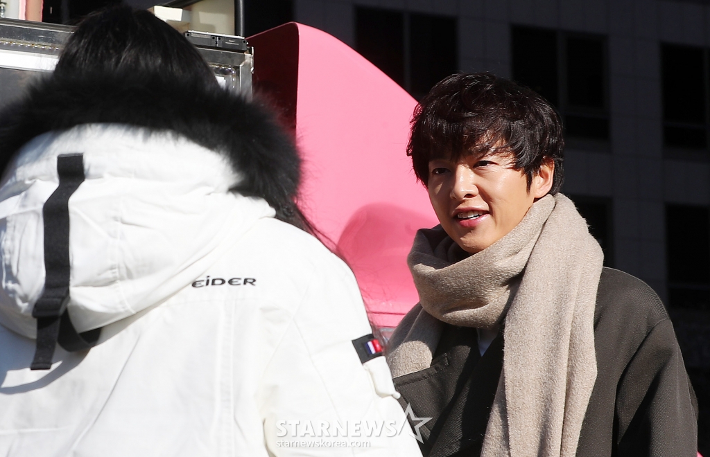 배우 송중기가 24일 오후 서울 중구 한국프레스센터 앞 광장에서 진행된 영화 '보고타: 마지막 기회의 땅' 간식차 이벤트 행사에 참석해 팬과 인사하고 있다.