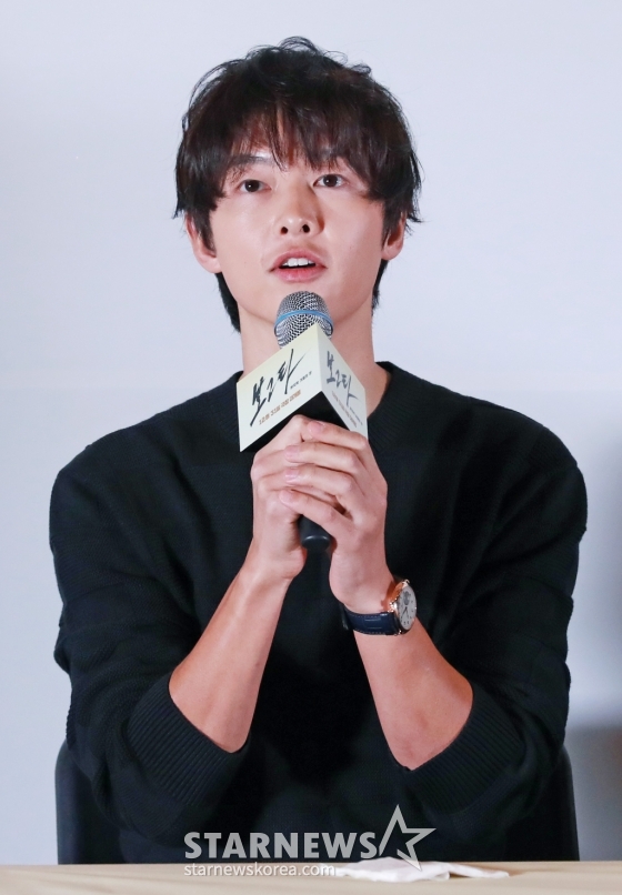 배우 송중기가 19일 오후 서울 메가박스 코엑스에서 진행된 영화 '보고타 : 마지막 기회의 땅'(감독 김성제) 언론배급시사회 및 기자간담회에 참석해 질문에 답하고 있다. /2024.12.19 /사진=이동훈 photoguy@