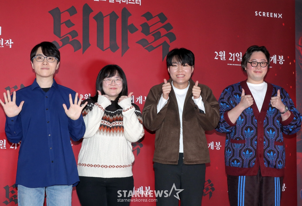 성우 남도형, 정유정, 김민주, 황창영이 4일 오후 서울 송파구 롯데월드타워 롯데시네마에서 진행된 오컬트 애니메이션 '퇴마록' VIP 시사회에 참석해 포즈를 취하고 있다.