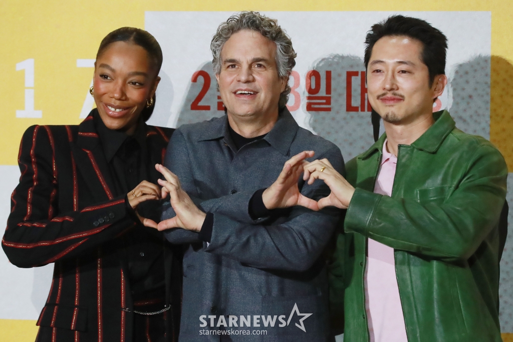 배우 나오미 애키, 마크 러팔로, 스티븐 연이 20일 오전 서울 강남구 메가박스 코엑스에서 진행된 영화 '미키17'(감독 봉준호) 기자간담회에 참석해 인사말을 하고 있다.