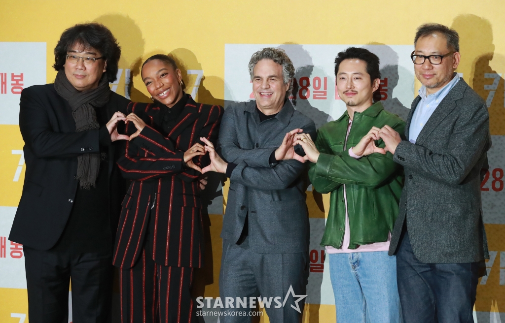 봉준호 감독, 배우 나오미 애키, 마크 러팔로, 스티븐 연, 최두호 프로듀서가 20일 오전 서울 강남구 메가박스 코엑스에서 진행된 영화 '미키17'(감독 봉준호) 기자간담회에 참석해 포즈를 취하고 있다.