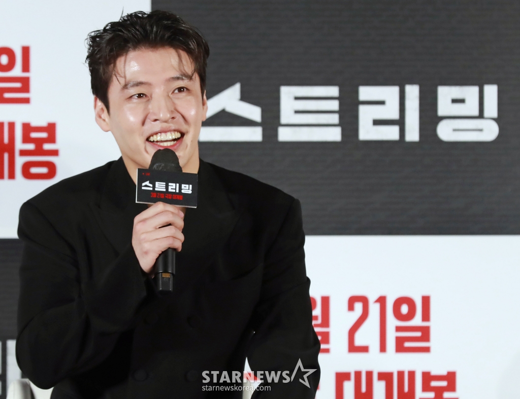 배우 강하늘이 26일 오전 서울 광진구 롯데시네마 건대입구점에서 진행된 영화 '스트리밍'(감독 조장호) 제작발표회에 참석해 질문에 답하고 있다.