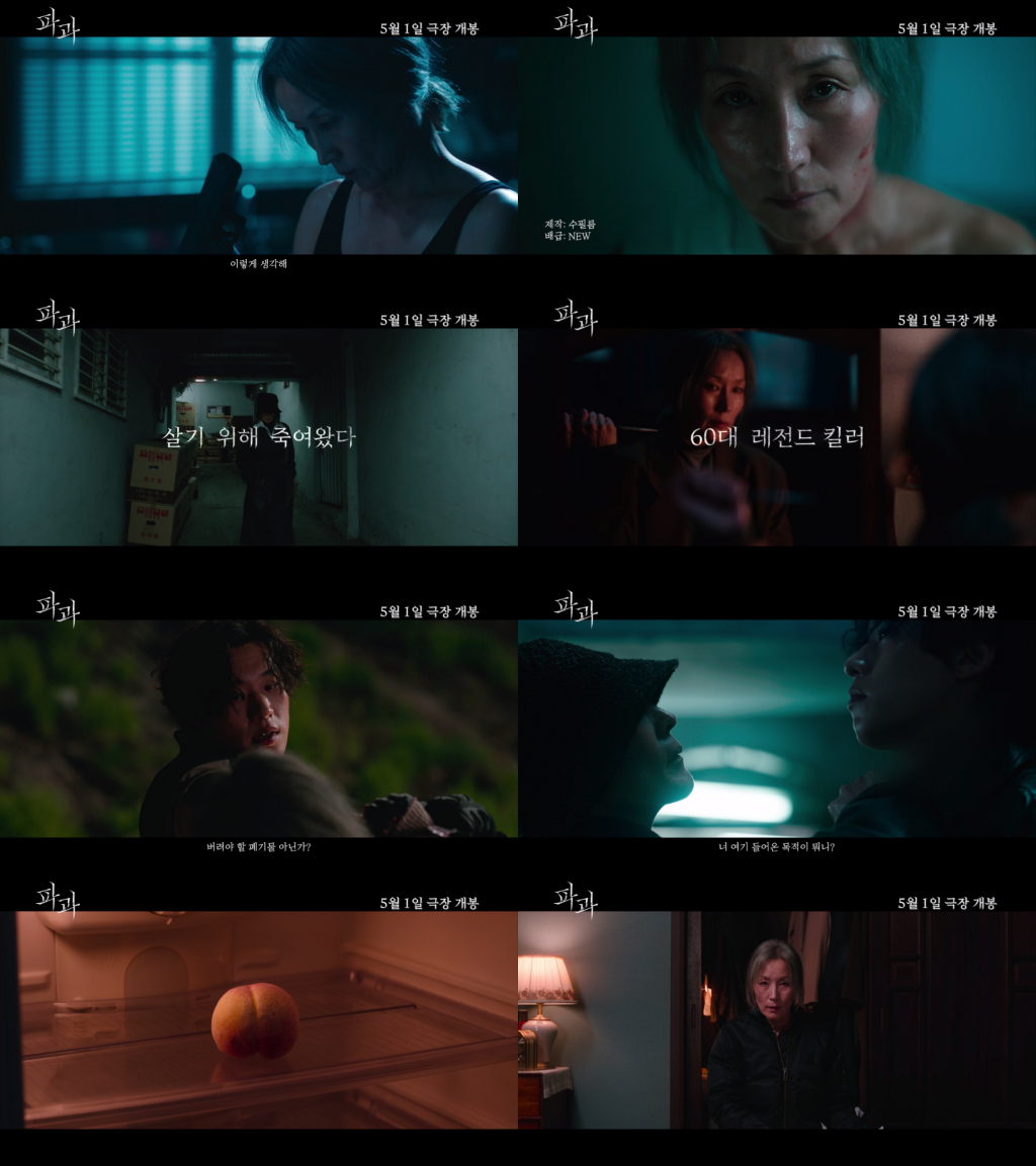 함께 공개된 1차 예고편은 " 이렇게 생각해, 벌레 한 마리 죽인 거라고" 라는 '조각'의 스승 '류'(김무열 분)의 대사와 함께 긴장감을 고조시키는 음악으로 포문을 연다. '설화'(신시아 분)의 피 묻은 얼굴이 60대 레전드 킬러 '조각'으로 바뀌며, "우리 일은 악성 벌레 퇴치하는 신성한 일이야" 라는 강렬한 대사와 함께 오랜 시간 악성 벌레들을 방역해온 그녀의 이야기를 궁금하게 만든다. 어딘가 예전 같지 않은 자신을 바라보는 '조각'의 모습 위로 미스터리한 킬러 '투우'의 "늙고 쓸모 없어졌으니까 버려야 할 폐기물 아닌가?"라는 대사가 이어지며 '조각'과 '투우'가 서로를 견제하는 모습이 그려진다. "너 여기 들어온 목적이 뭐니?"라는 '조각'의 날카로운 질문은 두 킬러 간의 격렬한 대결을 예고한다. 이처럼, 유례없는 60대 킬러를 중심으로 격동하는 감정의 파고를 전달할 액션 드라마 '파과'는 5월 극장가에 신선한 활기를 불어넣을 전망이다.
