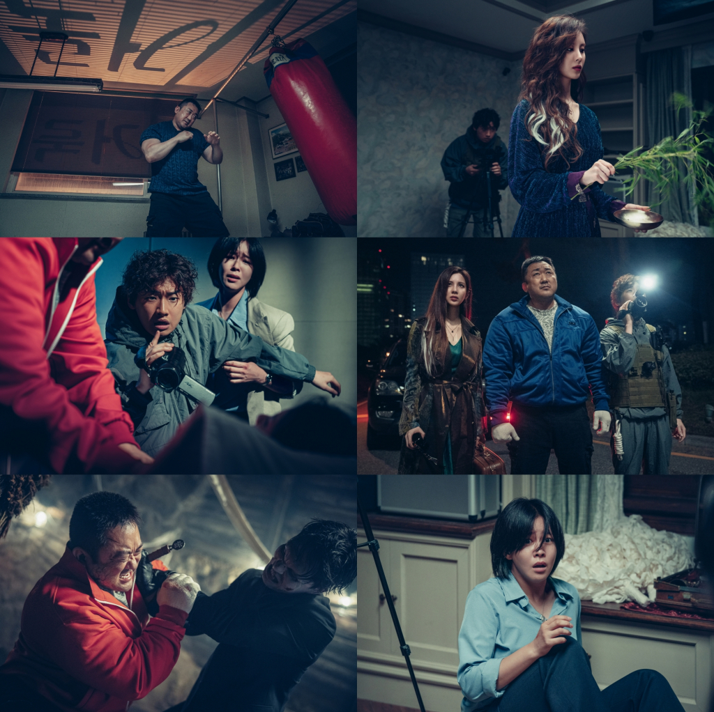 공개된 보도스틸은 올봄 극장가를 시원하게 강타할 '거룩한 밤' 팀의 출격과 함께 역대급 미션으로 '거룩한 밤' 팀을 찾은 의뢰인 자매의 서스펜스 가득한 열연을 예고해 이목을 집중시킨다. 먼저 바위 같은 힘과 주먹으로 악마를 사냥하는 '바우'(마동석 분)를 필두로 어떤 악마라도 퇴마할 수 있는 강력한 퇴마사 '샤론'(서현 분), 악마를 찾아내는 멀티플레이어 '김군'(이다윗 분)으로 구성된 '거룩한 밤' 팀의 강렬한 케미스트리로 시선을 사로잡는다.
