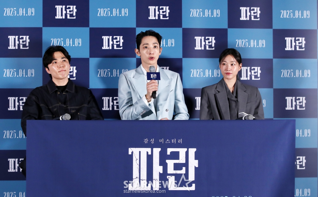 강동인 감독, 배우 이수혁, 하윤경이 28일 오후 서울 용산구 CGV 아이파크몰에서 열린 영화 '파란'(감독 강동인) 언론시사회에 참석해 질의응답을 하고 있다.