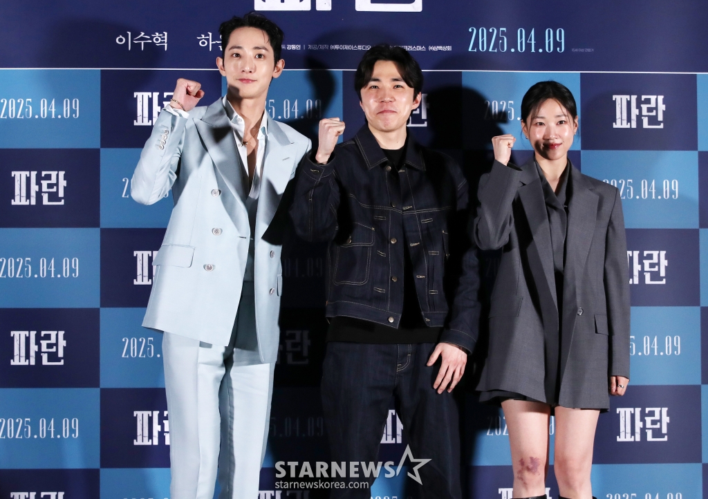 배우 이수혁, 강동인 감독, 배우 하윤경이 28일 오후 서울 용산구 CGV 아이파크몰에서 열린 영화 '파란'(감독 강동인) 언론시사회에 참석해 포즈를 취하고 있다.