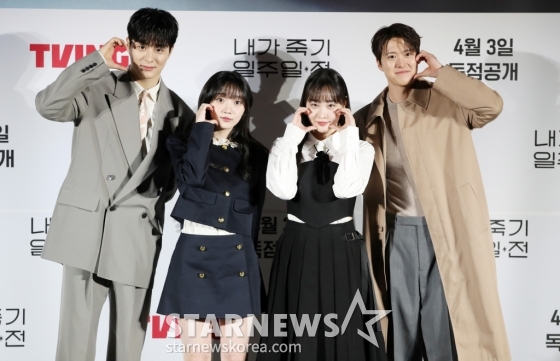 배우 정건주, 오우리, 김민하, 공명이 1일 오전 서울 CGV 용산아이파크몰에서 열린 티빙 오리지널 시리즈 '내가 죽기 일주일 전' 제작발표회에 참석해 포즈를 취하고 있다.