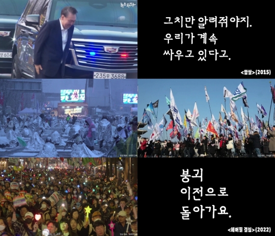 1일 공개된 영상성명서에는 영화계 거장 정지영, 임순례, 허진호, '서울의 봄' 김성수, '1987' 장준환, '원더랜드' 김태용, '다음, 소희' 정주리, '대도시의 사랑법' 이언희 감독과 정진영, 박해일 배우 등 성명에 참여한 영화인 1,025명의 이름이 엔딩 크레딧에 올라갔다. 또한 탄핵 정국과 일맥상통하는 한국영화 속 명대사들과 헌법재판소의 윤석열 탄핵심판 선고를 애타게 기다리며 시위 현장에 나간 시민들의 모습이 담겼다.