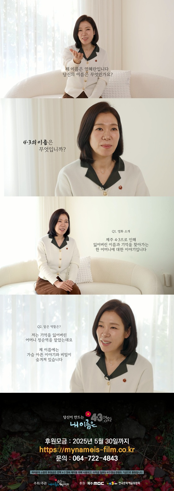 2일, 주정공장수용소 4·3역사관에서 열리는 위령굿을 스케치하고 3일 크랭크인, 추념식 장면으로 본격적인 첫 촬영에 돌입한 것이다. 크랭크인 소식과 함께 영화의 주인공인 염혜란 배우의 '내 이름은'의 '4·3 이름 찾기' 캠페인 영상도 공개됐다.