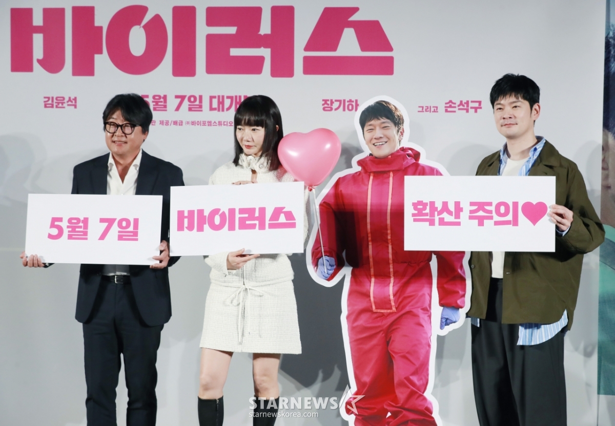 배두 김윤석, 배두나, 장기하가 16일 오전 서울 강남구 메가박스 코엑스에서 진행된 영화 '바이러스' 제작보고회에 참석해 포즈를 취하고 있다.