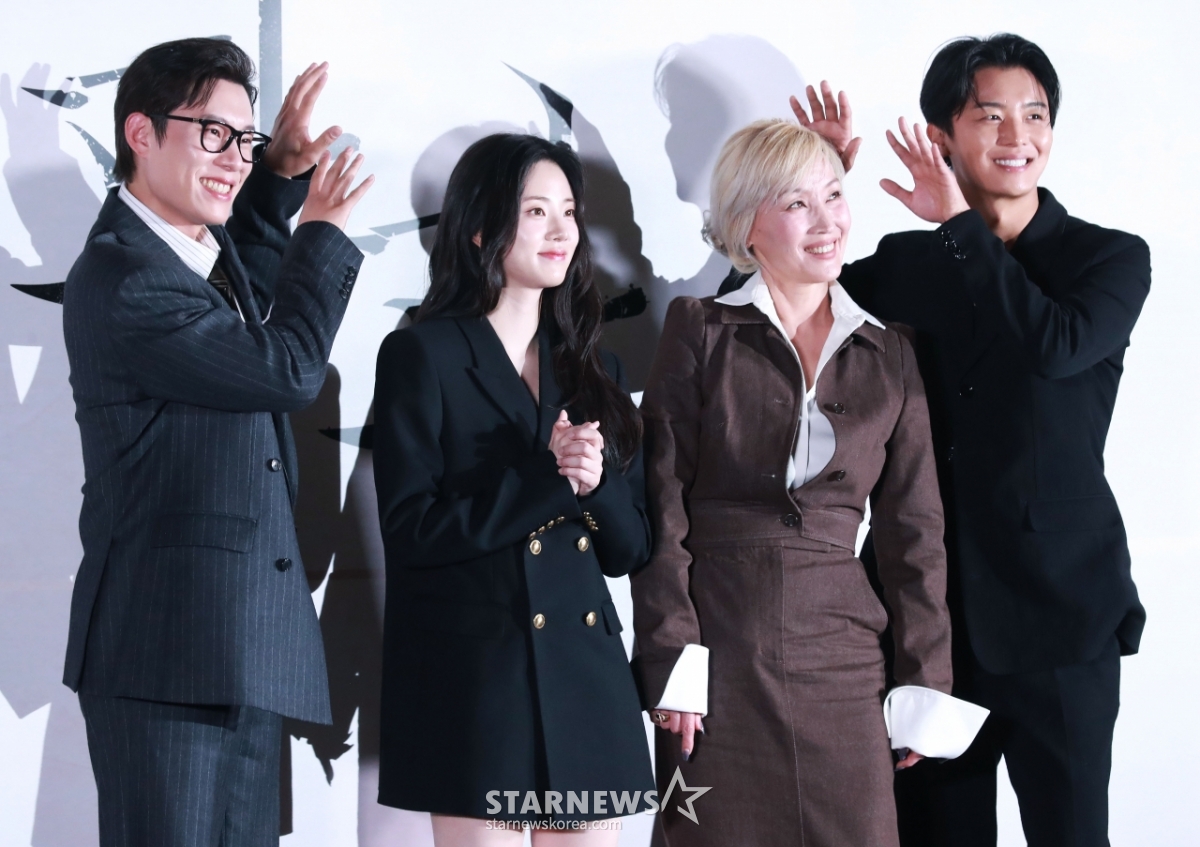 배우 김성철, 신시아, 이혜영, 연우진이 24일 오후 서울 CGV용산아이파크몰에서 진행된 영화 '파과'(감독 민규동) 언론배급시사회 및 기자간담회에 참석해 포즈를 취하고 있다.