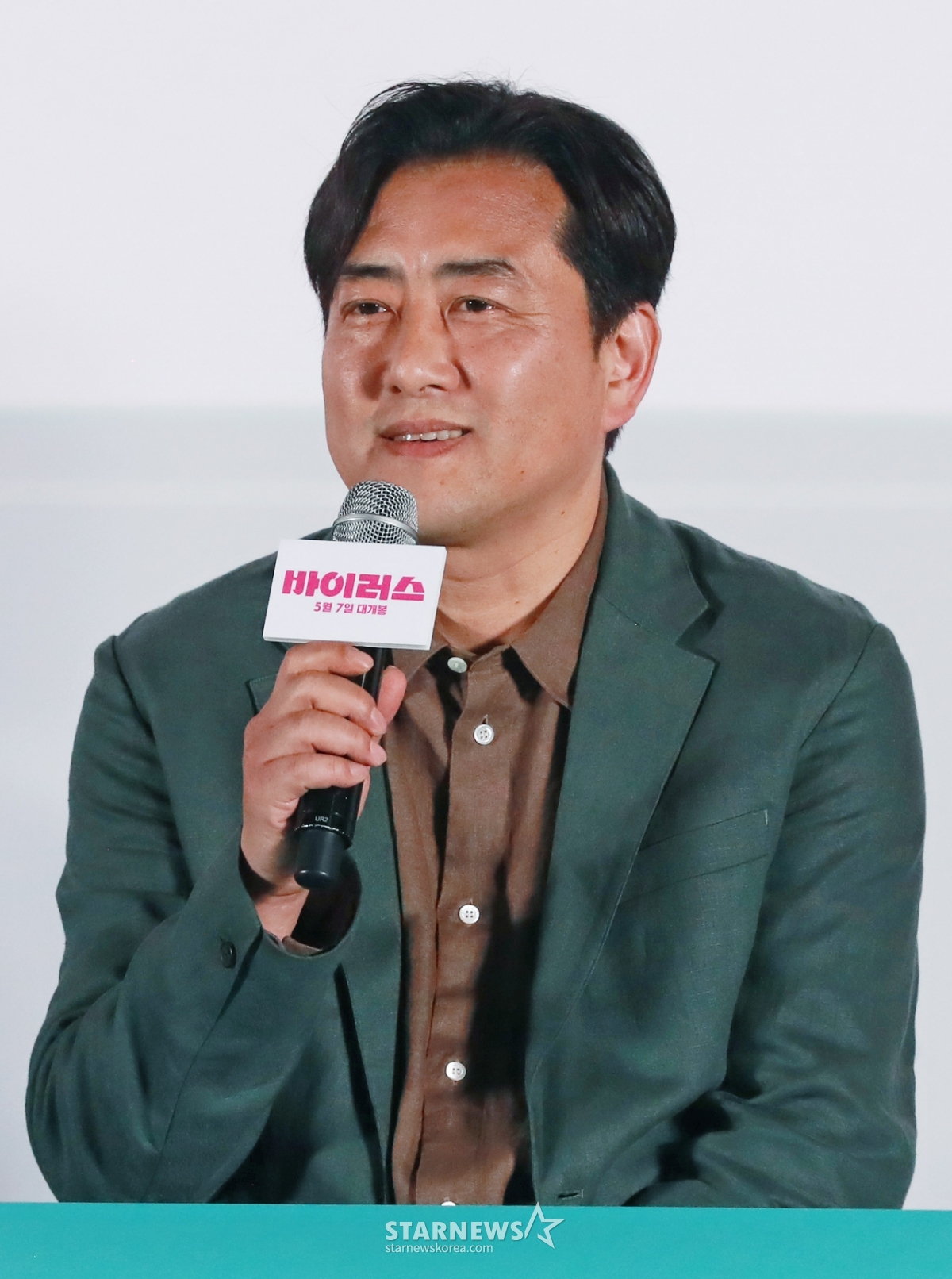 강이관 감독이 28일 오후 서울 CGV 용산아이파크몰에서 진행된 영화 '바이러스'(감독 강이관) 언론배급시사회 및 기자간담회에 참석해 질문에 답하고 있다.