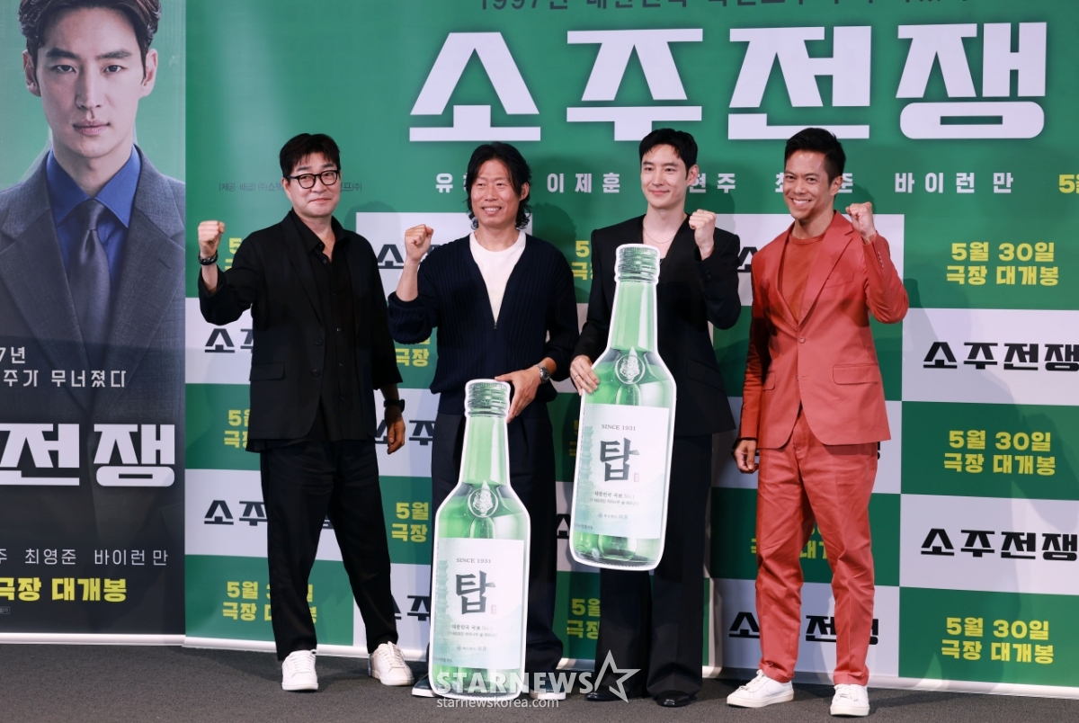 배우 손현주, 유해진, 이제훈, 바이런 만이 29일 오후 서울 CGV용산아이파크몰에서 진행된 영화 '소주전쟁' 언론배급시사회 및 기자간담회에 참석해 포즈를 취하고 있다.