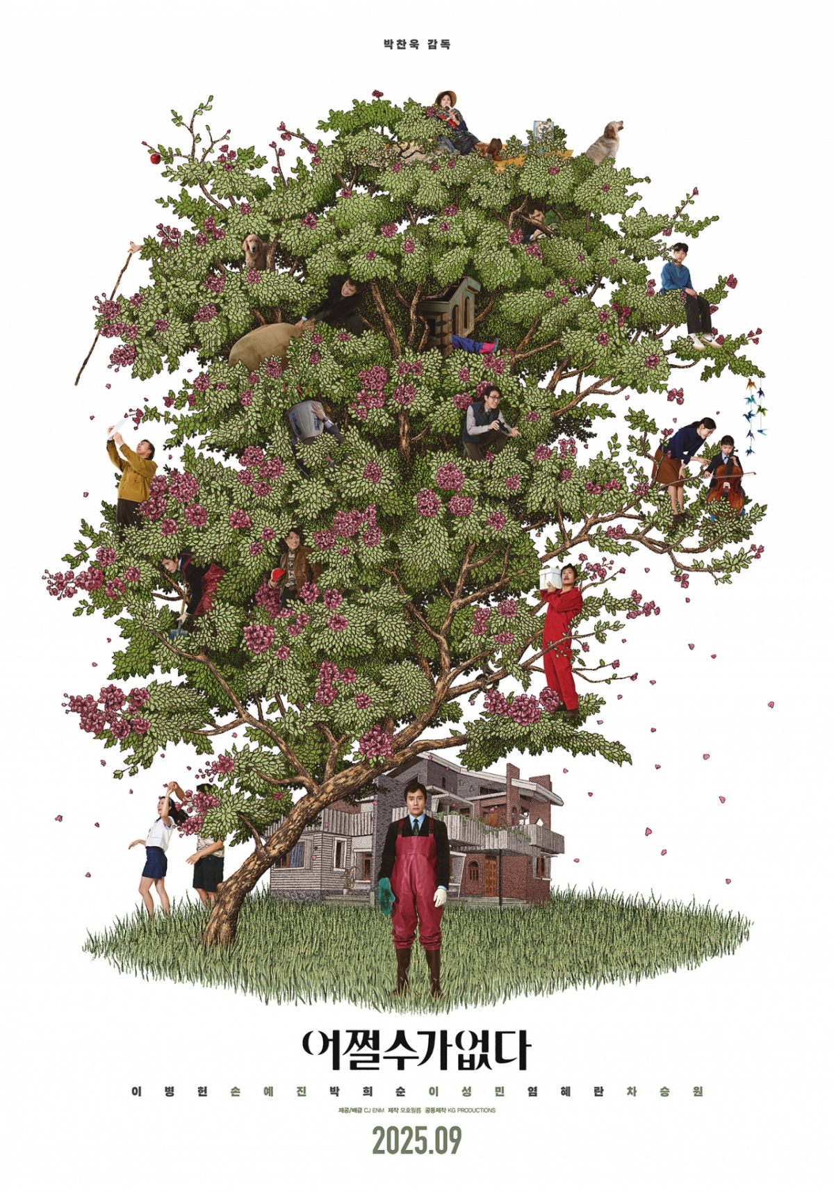 '어쩔수가없다'의 1차 포스터는 디테일이 돋보이는 일러스트 디자인으로 시선을 사로잡는다. 재취업을 위해 분투하는 '만수'와 특유의 에너지 넘치는 아내 '미리'(손예진 분), 부부의 두 아이 '시원', '리원'과 반려견 두 마리가 곳곳에 자리한 가운데, 여유로운 표정의 '선출'(박희순 분), 종이를 응시하는 '범모'(이성민 분)와 피크닉을 즐기는 '아라'(염혜란 분), 구두를 들고 있는 '시조'(차승원 분)까지 배롱나무에 숨겨진 다양한 사연의 인물들이 호기심을 자극한다. 반드시 지켜내야 하는 집 앞에 서 있는 '만수'의 비장한 모습은, 흩날리는 꽃잎 속에서 '미리'와 춤을 추며 행복했던 한때의 '만수'와 대조를 이뤄, 갑작스러운 해고를 기점으로 펼쳐질 예측 불가한 상황에 대한 궁금증을 더한다.