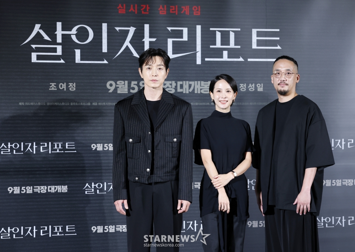 배우 정성일, 조여정, 조영준 감독이 12일 서울 용산구 CGV 용산아이파크몰에서 열린 영화 '살인자 리포트'(감독 조영준) 제작보고회에 참석해 포즈를 취하고 있다.