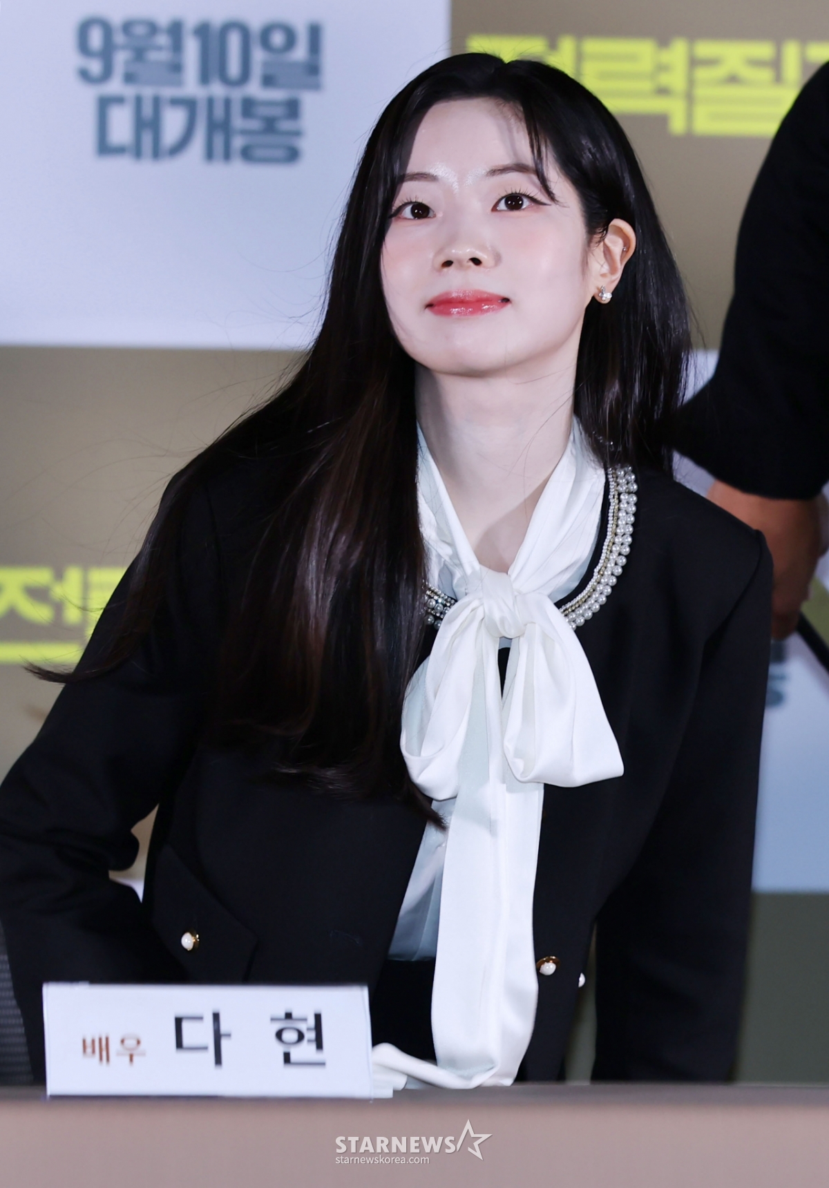 배우 다현이 5일 오후 서울 롯데시네마월드타워점에서 진행된 영화 '전력질주'(감독 이승훈) 언론배급시사회 및 기자간담회에 참석해 자리에 앉고 있다.