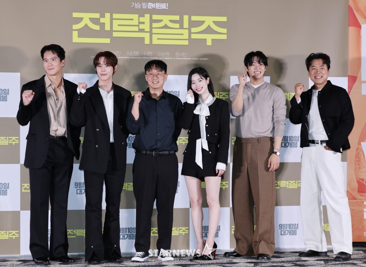 배우 하석진, 윤서빈, 이승훈 감독, 배우 다현, 이신영, 이순원이 5일 오후 서울 롯데시네마월드타워점에서 진행된 영화 '전력질주'(감독 이승훈) 언론배급시사회 및 기자간담회에 참석해 포즈를 취하고 있다.