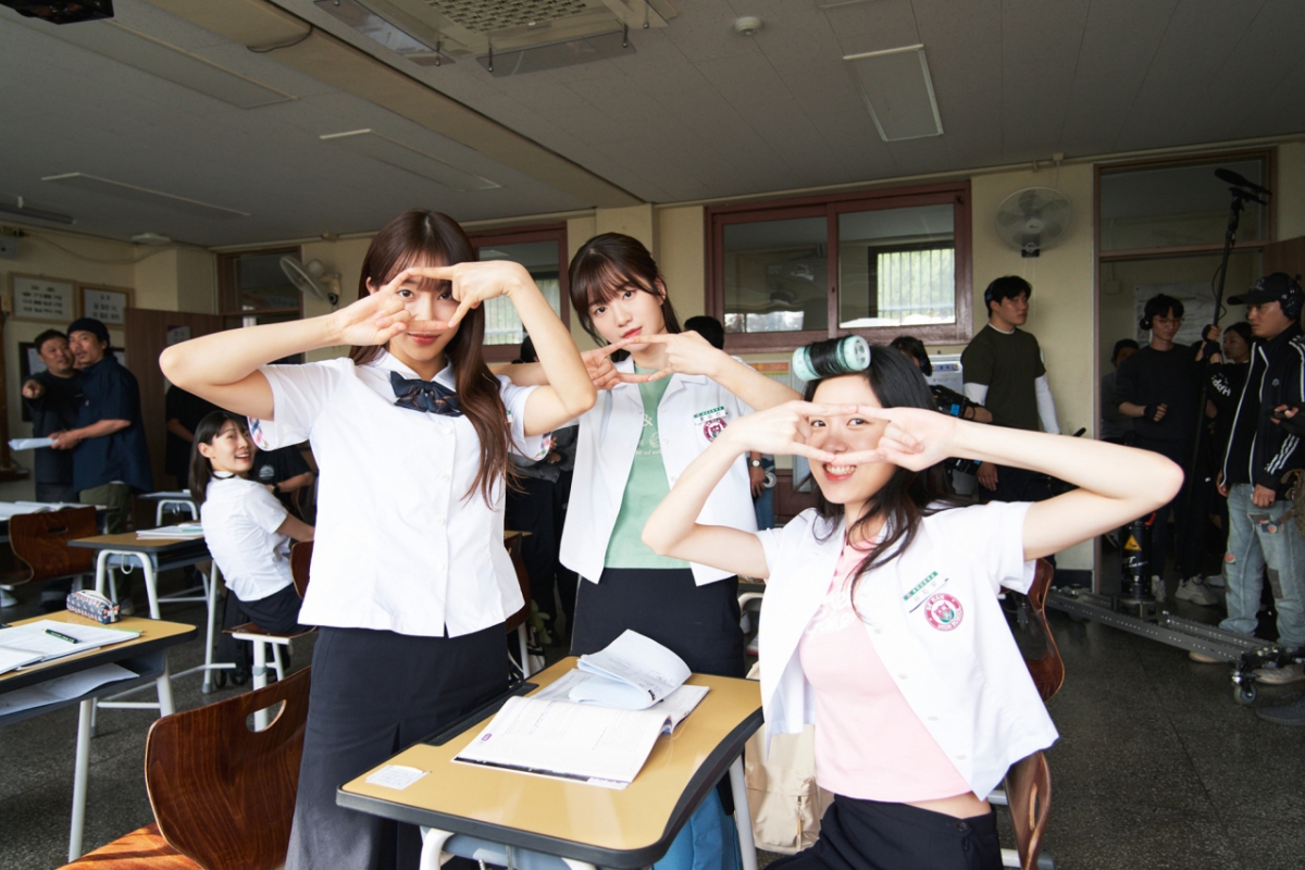 공개된 비하인드 스틸은 '귀시' 촬영 현장에서 포착된 진지하면서도 화기애애한 분위기를 담아 눈길을 끈다. 먼저, 배우 배수민은 동료 배우들과 함께 '여우 창문' 포즈를 취한 단체 사진 속 고등학생 역할에 맞는 풋풋하고 생기 넘치는 모습으로 공포영화 촬영 현장에서도 빛났던 압도적인 비주얼을 자랑한다.