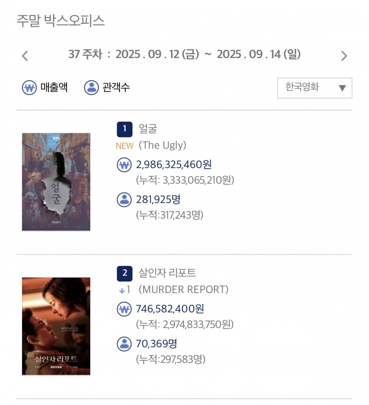 '살인자 리포트'는 개봉 2주차 주말에도 꾸준한 흥행 기세를 보였다. 영화관 입장권 통합 전산망 기준, 14일까지 누적 관객수 29만 7583명을 동원한 '살인자 리포트'는 개봉 2주차에도 한국영화 TOP2 자리를 지켰다.