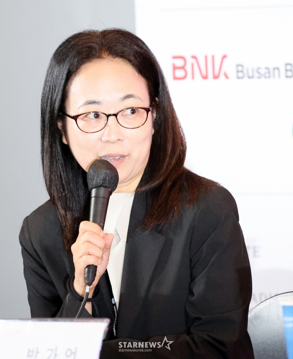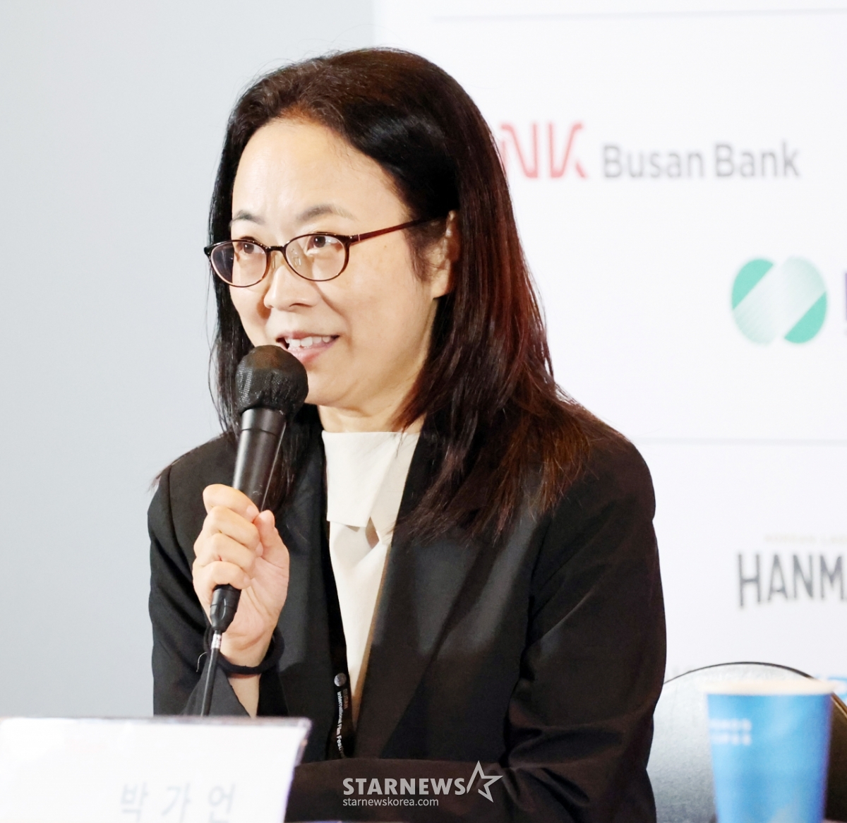 17일 부산 해운대 영화의 전당 중극장에서 열린 부산국제영화제 BIFF 2025 개막작품인 '어쩔수가 없다' 개막 기자회견에서 박가언 수석프로그래머가 소감을 밝히며 진행을 하고 있다. 2025.09.17.