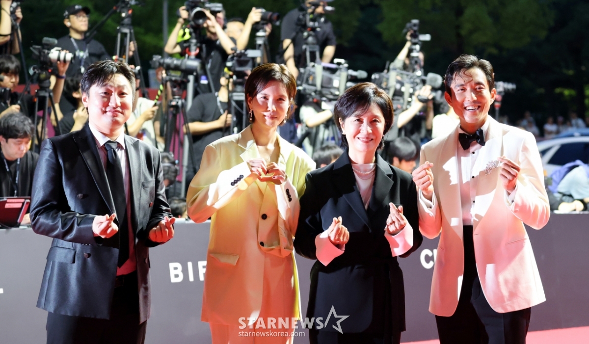 영화 '흐르는 여정' 배우 저스틴 민과 배우 김혜옥, 공민정, 김진유 감독이 17일 부산 해운대 영화의 전당에서 열리는 부산국제영화제 'BIFF2025' 개막식 레드카펫에서 포토타임을 갖고 있다. 2025.09.17.