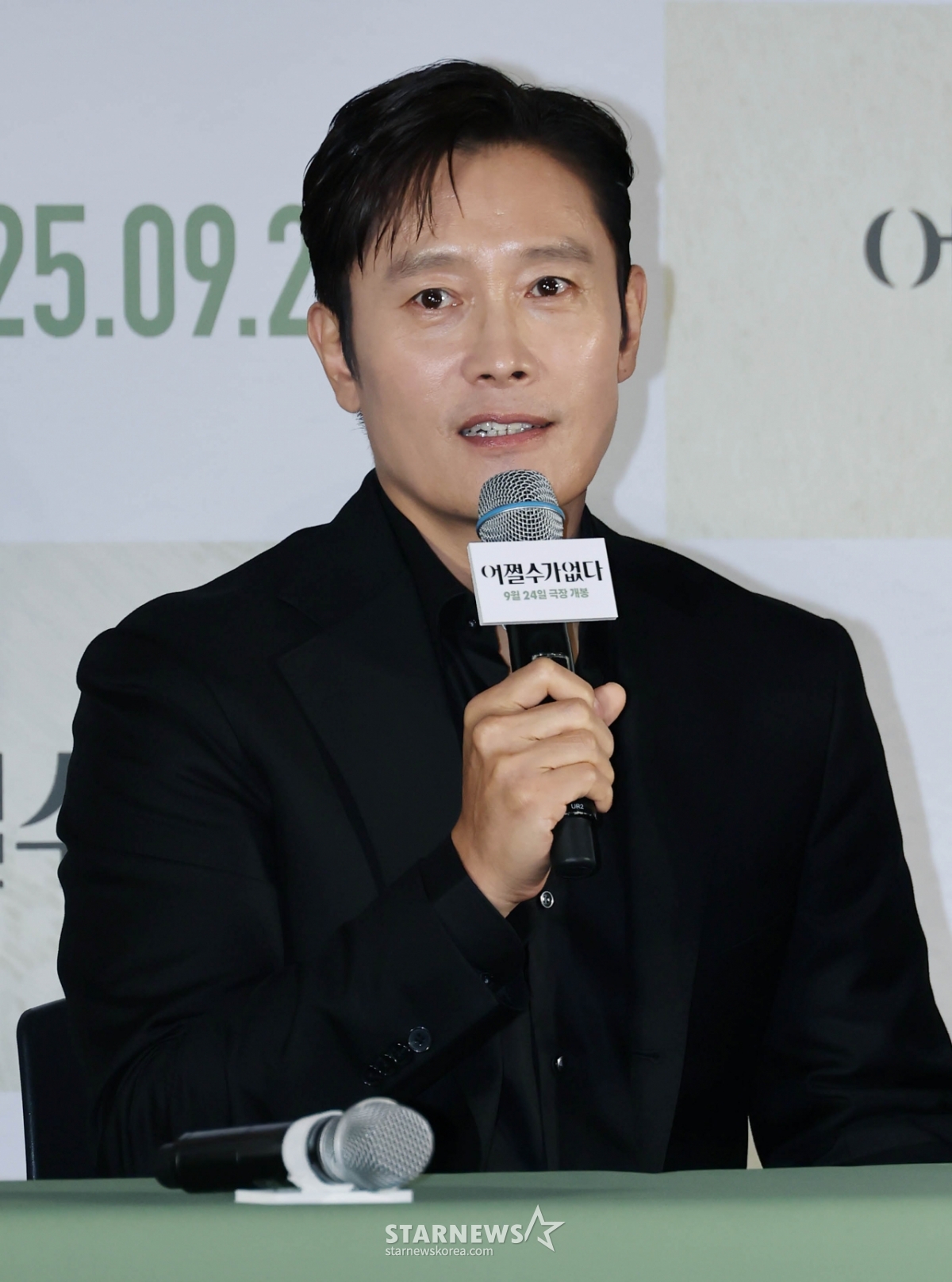 배우 이병헌이 22일 오후 서울 CGV용산아이파크몰에서 진행된 영화 '어쩔수가 없다'(감독 박찬욱) 언론배급시사회 및 기자간담회에 참석해 질문에 답하고 있다.