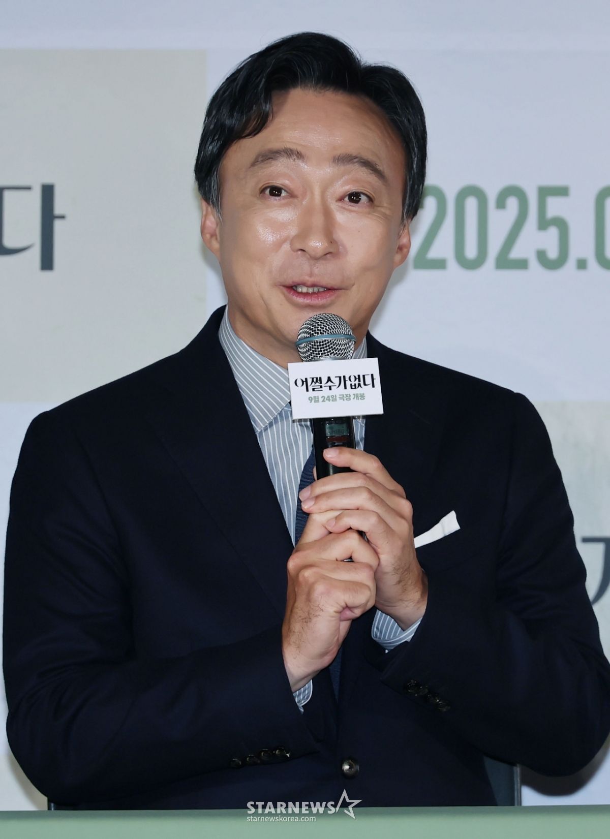배우 이성민이 22일 오후 서울 CGV용산아이파크몰에서 진행된 영화 '어쩔수가 없다'(감독 박찬욱) 언론배급시사회 및 기자간담회에 참석해 질문에 답하고 있다.