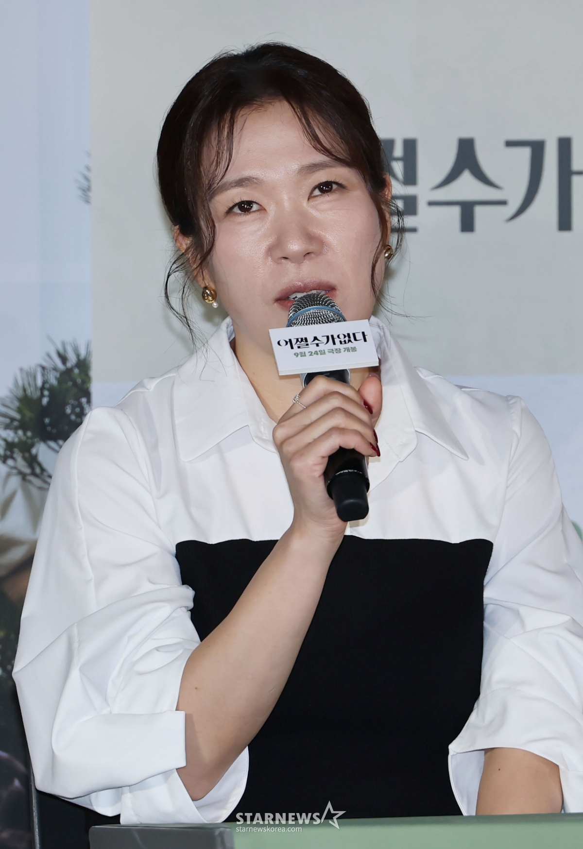 배우 염혜란이 22일 오후 서울 CGV용산아이파크몰에서 진행된 영화 '어쩔수가 없다'(감독 박찬욱) 언론배급시사회 및 기자간담회에 참석해 질문에 답하고 있다.