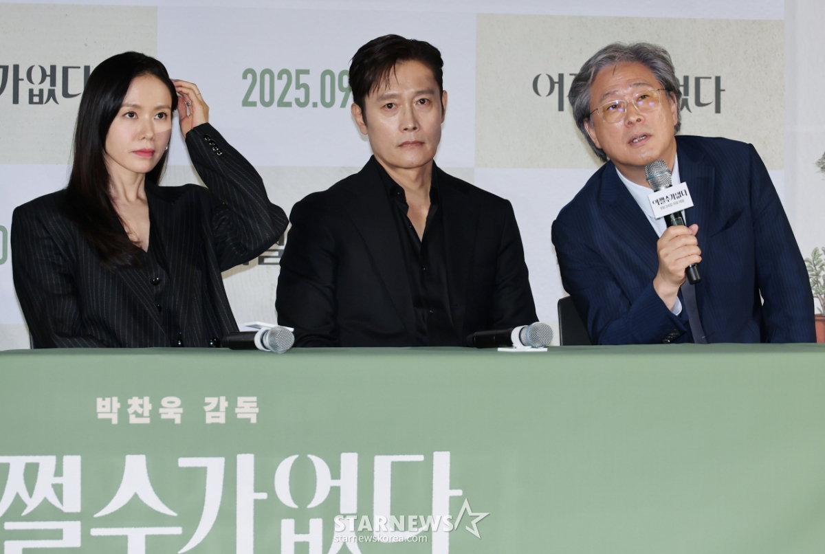배우 손예진, 이병헌, 박찬욱 감독이 22일 오후 서울 CGV용산아이파크몰에서 진행된 영화 '어쩔수가 없다'(감독 박찬욱) 언론배급시사회 및 기자간담회에 참석해 질문에 답하고 있다.