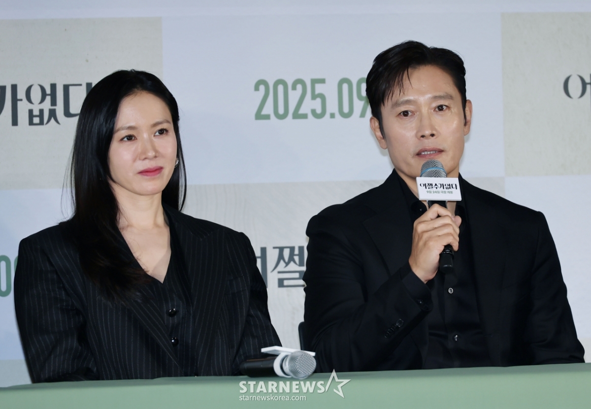 배우 손예진, 이병헌이 22일 오후 서울 CGV용산아이파크몰에서 진행된 영화 '어쩔수가 없다'(감독 박찬욱) 언론배급시사회 및 기자간담회에 참석해 질문에 답하고 있다.