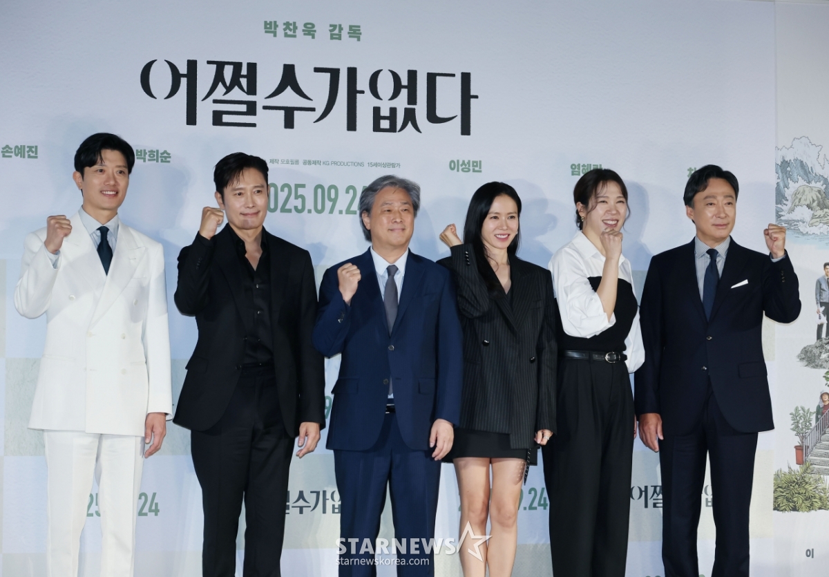 배우 박희순, 이병헌, 박찬욱 감독, 배우 손예진, 염혜란, 이성민이 22일 오후 서울 CGV용산아이파크몰에서 진행된 영화 '어쩔수가 없다'(감독 박찬욱) 언론배급시사회 및 기자간담회에 참석해 포즈를 취하고 있다.
