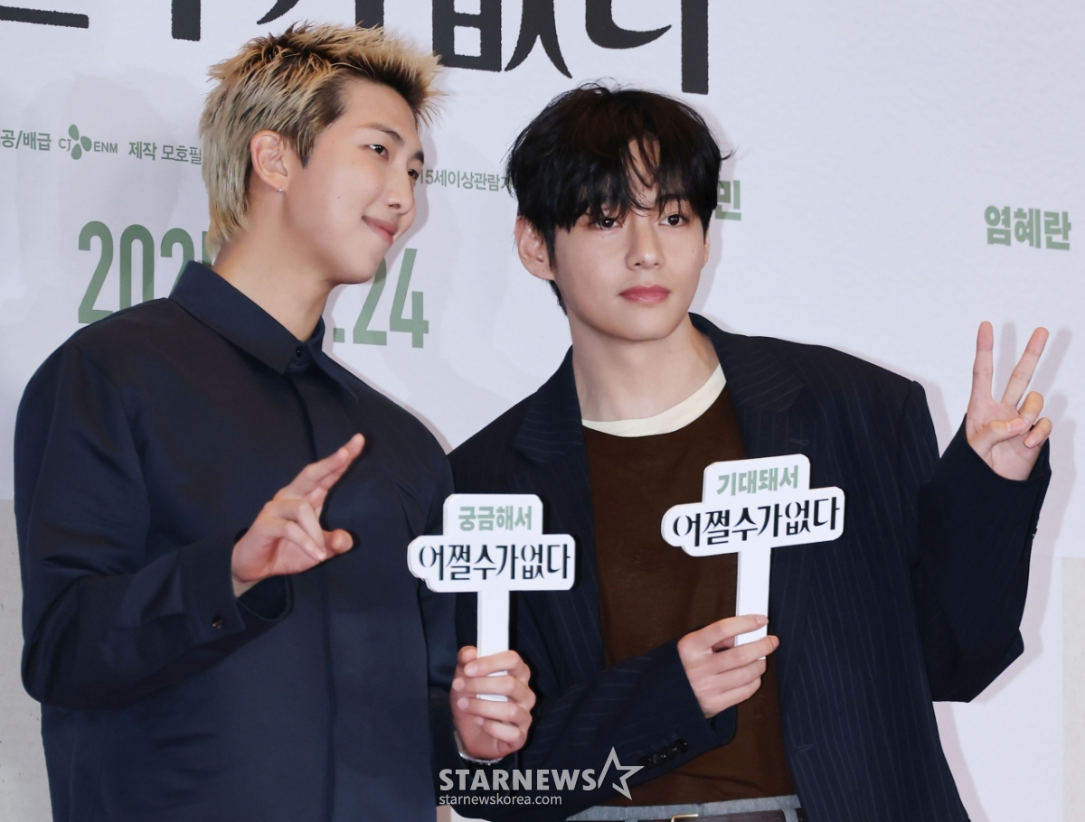 방탄소년단 RM, 뷔가 22일 오후 서울 CGV용산아이파크몰에서 진행된 영화 '어쩔수가 없다'(감독 박찬욱) VIP시사회에 참석해 포즈를 취하고 있다.