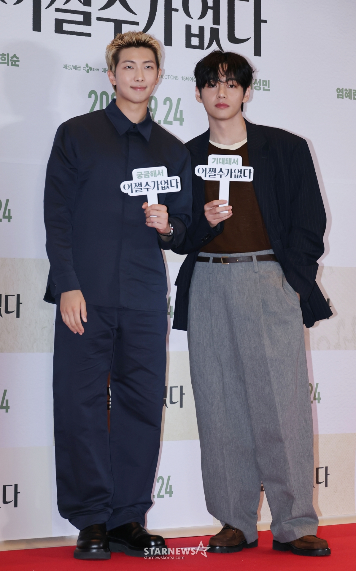 방탄소년단 RM, 뷔가 22일 오후 서울 CGV용산아이파크몰에서 진행된 영화 '어쩔수가 없다'(감독 박찬욱) VIP시사회에 참석해 포즈를 취하고 있다.