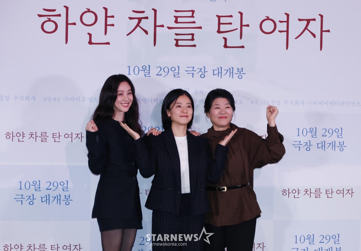 배우 정려원, 고혜진 감독, 배우 이정은이 27일 오후 서울 CGV용산아이파크몰에서 진행된 영화 '하얀 차를 탄 여자'(감독 고혜진) 언론배급시사회 및 기자간담회에 참석해 포즈를 취하고 있다.