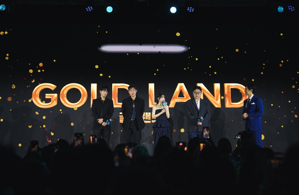 '골드랜드'의 김성훈 감독을 비롯해 배우 박보영, 김성철, 이현욱이 참석했다. '골드랜드'는 밀수 조직의 금괴를 우연히 넘겨받게 된 '희주'(박보영 분)가 금괴를 둘러싼 여러 군상들의 탐욕과 배신이 얽힌 아수라장 속에서 금괴를 독차지하려는 욕망에 사로잡혀 벌이는 사투를 그린 작품.