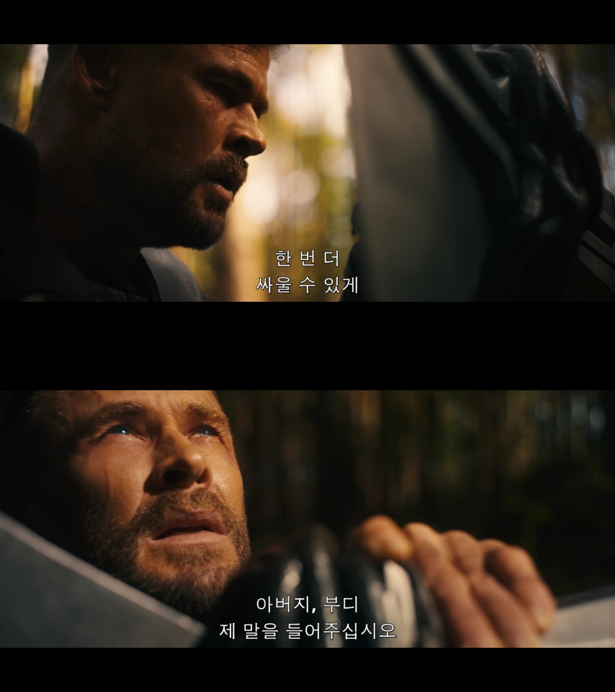 최근 공개된 예고편은 전지전능한 천둥의 신 '토르'가 지금껏 본 적 없는 간절함으로 아버지 '오딘'에게 기도하는 장면을 담아내며 단숨에 이목을 집중시킨다. 거대한 전투를 앞두고 나무 앞에 무릎을 꿇은 그는 "제게 선조들의 힘을 주십시오. 한 번 더 싸울 수 있게, 한 번만 더 적을 쓰러트리고 그 아이에게 돌아갈 수 있게" 라고 읊조린다. 그의 절박한 목소리는 신도, 히어로도 아닌 한 아이의 아버지로서 살아남아야만 하는 '토르'의 인간적인 면모를 고스란히 드러내며 깊은 울림을 전한다.