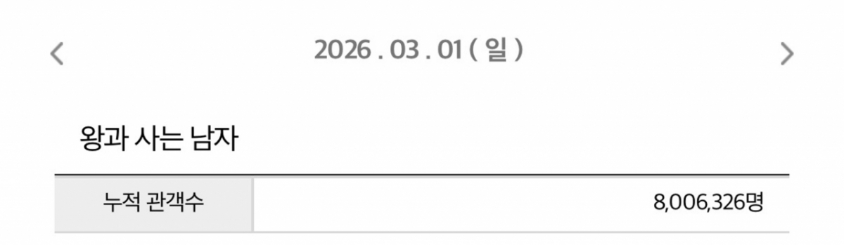 영화관입장권 통합전산망에 따르면 '왕과 사는 남자'는 개봉 26일째인 1일 기준 누적 관객수 800만 6326명을 기록했다. 관객들의 입소문과 N차 관람 열풍이 이어진 덕이다.