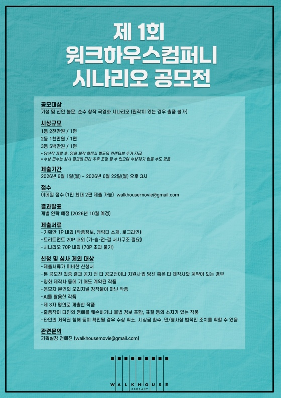 이번 공모전의 참가 접수는 오는 6월 1일부터 22일까지이며 공모 대상은 기성 및 신인 불문, 순수 창작 극영화 시나리오다. 공모전을 위해 구성된 전문가들과 워크하우스컴퍼니의 심사를 거친 수상작은 오는 10월 발표된다.
