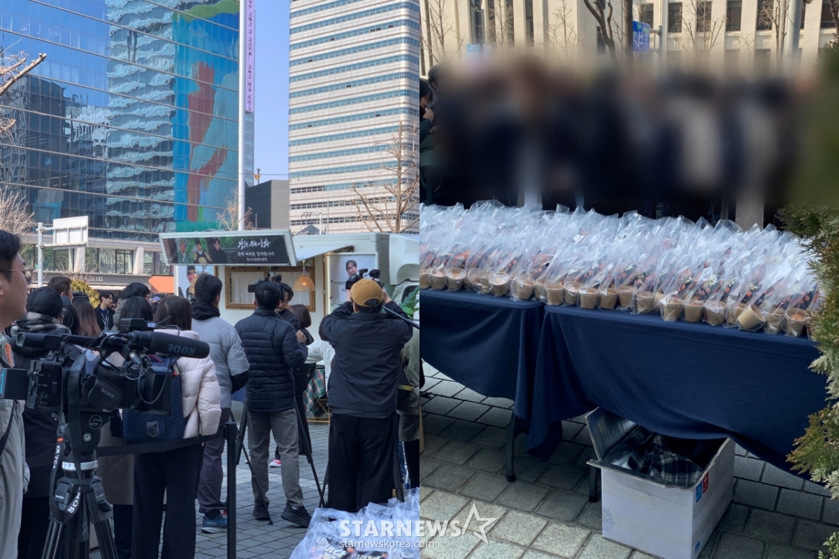 이날 현장은 커피차 이벤트 소식을 듣고 모인 팬들과 점심시간 인근을 지나던 직장인들로 인산인해를 이뤘다. 장항준 감독이 시간에 맞춰 모습을 드러내자 큰 환호와 플래시 세례가 쏟아졌고, 그는 밝은 미소와 손 인사로 화답했다.